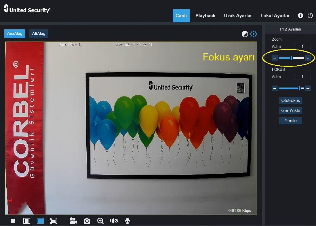 Bu menüden gerekli ayarları yapabilirsiniz. Kameranın görüş açısını değiştirmek, yani yakınlaştırıp uzaklaştırmak için, "Fokus Ayarı" alanında "+" veya "-" ikonlara tıklayabilir veya ortadaki butonu mouse ile tutup sağa veya sola çekebilirsiniz.
